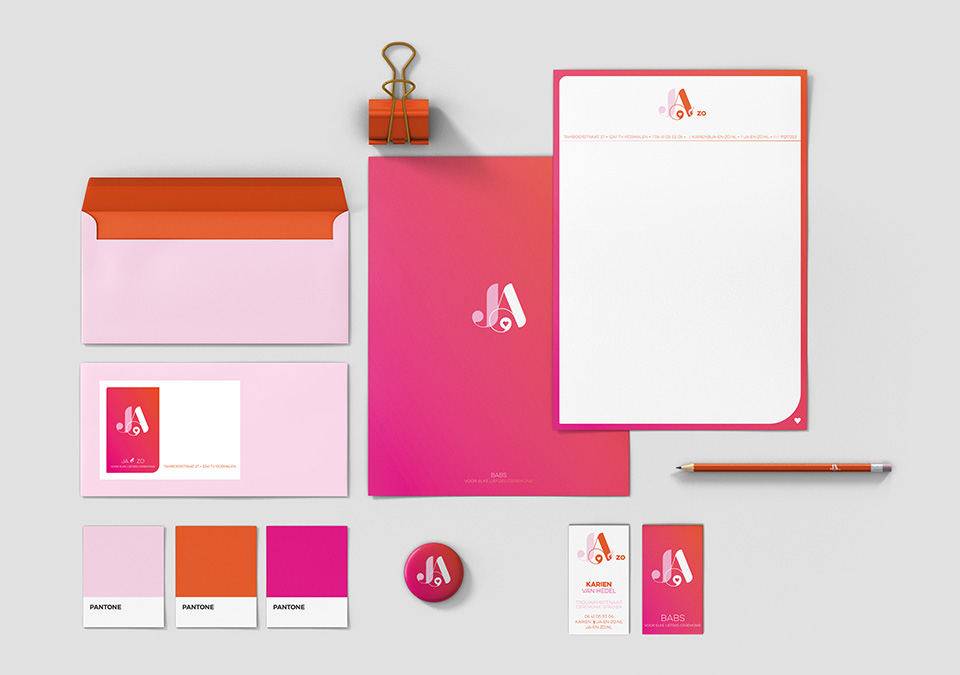 Nou bij Rakàta zijn we niet bang en al helemaal niet zuinig met kleur. Hoewel er ook wel eens heel ingetogen designs de deur uit gaan hoor. Maar Ja & Zo wilde graag een spetterende boodschap en … dat is gelukt. Het briefpapier, visitekaartje en de enveloppen zijn een feestje en ook op Social Media kan Karien strooien met haar kleurrijke boodschap. Spread the love honey!